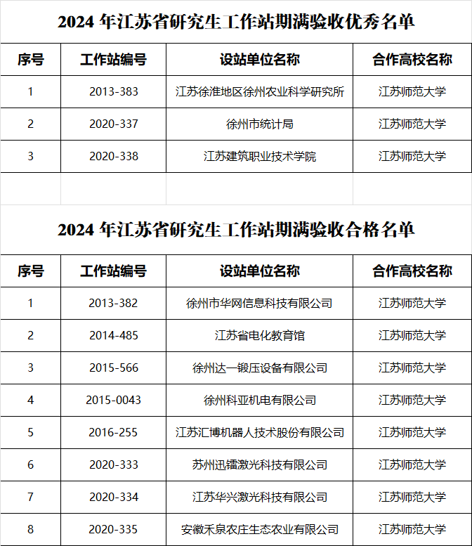 根据《江苏省研究生工作站管理办法》和《关于做好2024年江苏省研究生工作站年报和验收管理工作的通知》(苏教研函〔2024〕9号)要求,省教育厅、省科技厅对我校四年建设期满的省研究生工作站进行了验收。经过验收申请、高校审核、形式审查、专家评审和社会公示等程序,我校3家省研究生工作站期满验收结果为“优秀”,设站单位分别是:江苏徐淮地区徐州农业科学研究所、徐州市统计局和江苏建筑职业技术学院。另外,有8家省研究生工作站期满验收结果为“合格”。