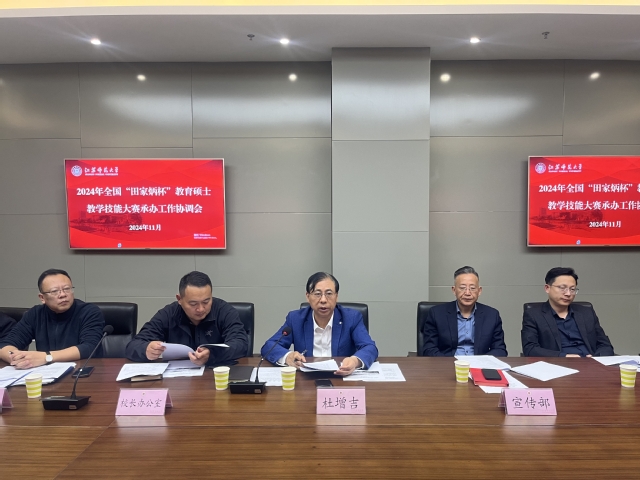 11月4日下午,2024年全国“田家炳杯”全日制教育硕士专业学位研究生学科教学(英语)和学科教学(语文)专业教学技能大赛承办工作协调会在分析测试中心101会议室召开,校党委常委、副校长杜增吉主持会议。校办、纪委、宣传部、教务部、研究生院、后管处、保卫处、信息化建设与管理处、后勤集团、教学资源保障中心、音乐学院、文学院、外国语学院等单位负责人、会议筹备人员参会。